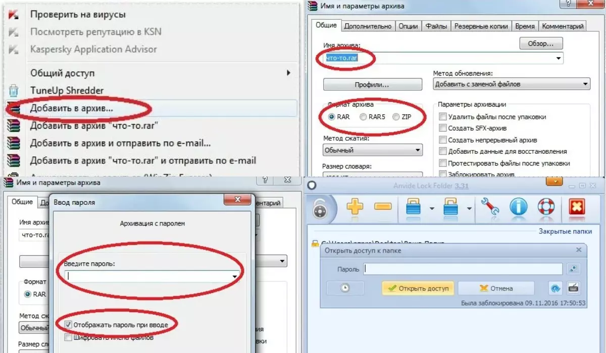 Далее поговорим о том, как запаролить через архив и специальные программы.